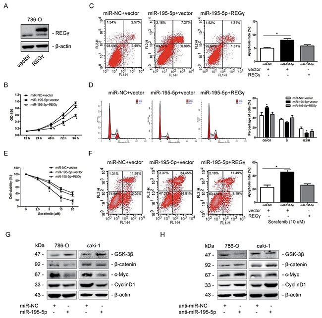 Figure 7: Restoration of REGγ markedly abolished the effects of miR-195-5p in RCC. (A) Restoration of REGγ in 786-O cells determined by western blots. (B) 786-O cells were transfected with miR-NC or miR-195-5p mimics and pcDNA5-REGγ plasmid or empty vector, and cell proliferation was analyzed by MTT assay. (C and D) Flow cytometry was performed on transfected 786-O cells to measure the apoptosis rate and cell cycle distribution, respectively. (E) Following transfection, 786-O cells were cultured with sorafenib at various concentrations of 0, 2.5, 5, 10, 20 μM for 24 h. And cell viability was determined by the MTT assay. (F) The transfected 786-O cells were treated with sorafenib at the concentration of 10 μM for 24 h, and apoptosis was measured by flow cytometry. (G and H) Western blot measurement of GSK-3β, β-catenin, c-Myc and Cyclin D1 protein expression levels following miR-195-5p overexpression (G) or suppression (H) in 786-O and caki-1 cells. β-actin was used as an internal control. The data are presented as mean ± SD of 3 independent experiments. *P < 0.05