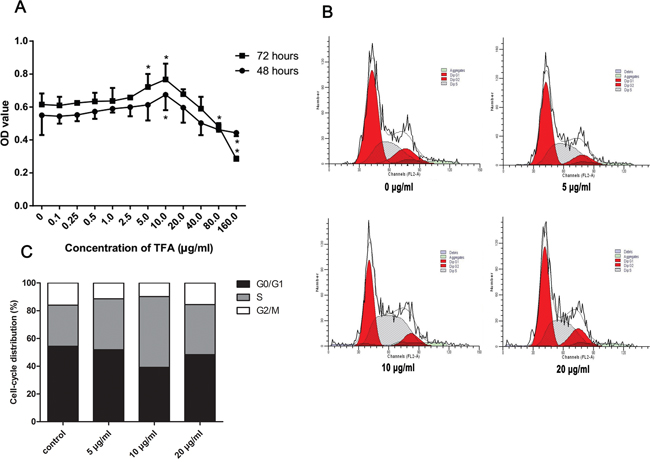 Based on the results on Figure 1A, 5 μg/ml, 10 μg/ml, and 20 μg/ml TFA represented the optimal working concentrations were used in our subsequent experiments.