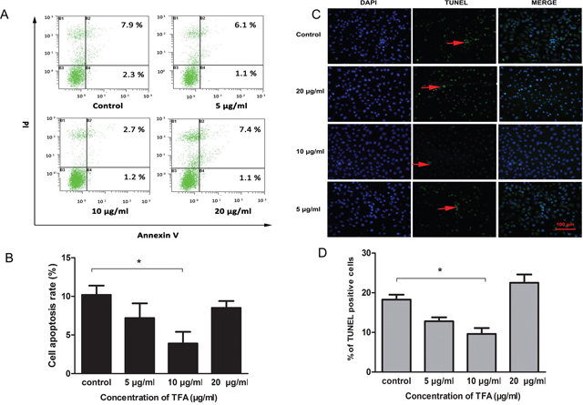 Figure 4: Effect of TFA on HUVECs apoptosis. (A) The images of Annexin V / PI detection. HUVECs treated with TFA (5 μg/ml, 10 μg/ml, 20 μg/ml) were stained with Annexin V-FITC and PI and analyzed by FACS. (B) Percentage of apoptotic rate (including early and late apoptotic cells) determined by FACS. (C) Distribution of TUNEL-labeled apoptotic cells (arrow) in different groups (magnification 200×). TUNEL-positive cells were labeled with FITC (green) and nuclei were labeled with DAPI (blue). (D) Percentage of TUNEL positive cells. Data was expressed as means±SD. *p < 0.05 compared with control group.