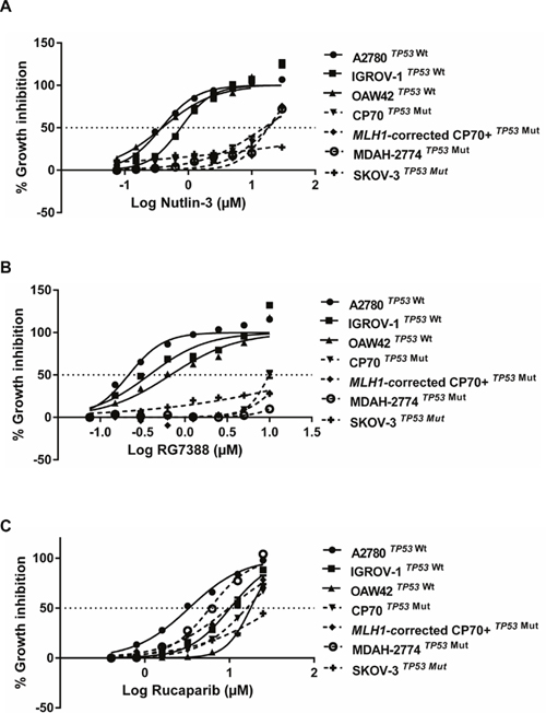 The growth inhibitory response of ovarian cancer cell lines to Nutlin-3/RG7388 and rucaparib