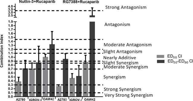Figure 3: The CI values for Nutlin-3/RG7388 in combination with rucaparib at ED50 and the average of CI values at effect levels ED50, ED75 and ED90 in three wild-type TP53 ovarian cancer cell lines. Data are shown as the average of at least 3 independent experiments and error bars represent SEM. CI, Combination Index; ED, Effective Dose.