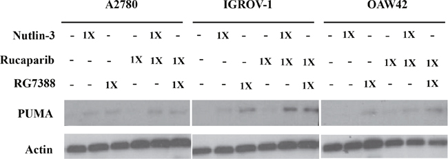 In the current study it was hypothesized that combination treatment of Nutlin-3/RG7388 with rucaparib further activates the p53 pathway by inhibition of PARP and results in enhanced induction and stabilization of p53 via Nutlin-3/RG7388 treatment to increase growth arrest and/or apoptosis in wild-type TP53 ovarian cancer cell lines.