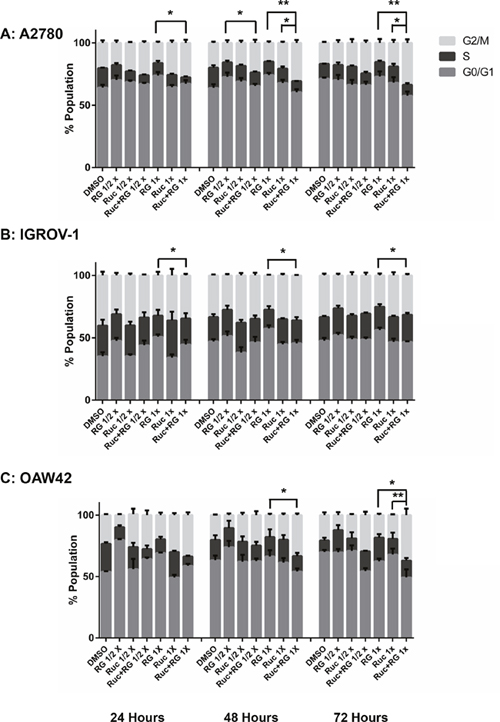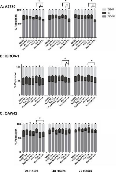 Figure 8: Combination of RG7388 with rucaparib affects the cell cycle distribution. Wild-type TP53 ovarian cancer cells were treated for 24, 48 and 72 hours with RG7388 or rucaparib alone and at constant 1:1 combination ratios of 1/2 X & 1X their respective GI50 concentrations. (A) A2780 cell line, (B) IGROV-1 cell line, (C) OAW42 cell line. RG, RG7388; Ruc, rucaparib; *, p <0.05; **, P < 0.01. Data are shown as the average of at least 3 independent experiments and error bars represent SEM.