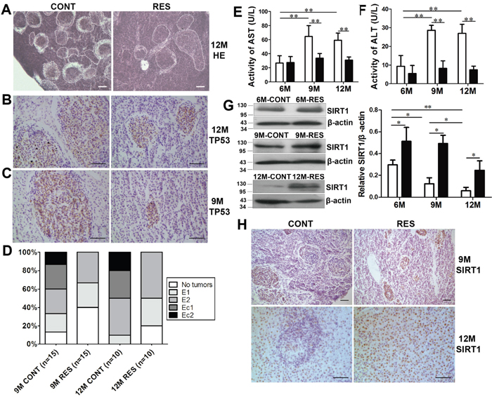 Figure 1: Resveratrol decreased age-dependent spontaneous tumorigenesis and increased protein level of SIRT1 in fish liver. (A) Histological observations in liver at 12-month-old. Dotted areas indicated the spontaneous neoplasms. Scale bar = 30 mm. CONT: control group, RES: resveratrol group. (B, C) Positive immunohistochemical reaction to mutant anti-p53 antibody in hepatic neoplasms. Scale bar = 50 mm (n = 3 in each group). (D) Malignant degree of neoplasms in 9- and 12-month-old fish. (E, F) Activities of serum hepatic marker enzymes (AST and ALT) at three developmental stages (n = 6 in each group). White: CONT group; black: RES group. (G, H) SIRT1 expression was detected by immunoblot and immunohistochemical staining. Scale bar = 50 mm (n = 3 in each group). Data were presented as mean±SD. *p <0.05, **p <0.01.