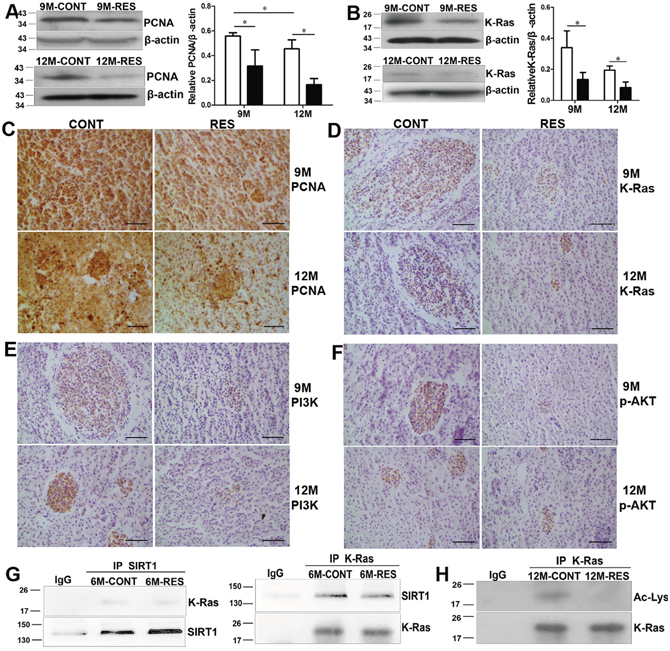 Figure 2: Resveratrol inhibited proliferation by SIRT1-mediated post-translational modulations of K-Ras. (A, B) Expression of PCNA and K-Ras measured by immunoblot at 9- and 12-month-old (n = 3 in each group). (C-F) Immunohistochemical analysis for PCNA, K-Ras, PI3K and p-AKT at 9- and 12-month-old (n = 3 in each group). (G) Interaction of K-Ras and SIRT1 at 6-month-old (n = 5 in each group). (H) Effects of resveratrol on acetylation of K-Ras (Ac-Lys) at 12-month-old (n = 5 in each group). Scale bar = 50 mm. Data were presented as mean±SD. *p <0.05.