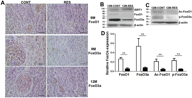Figure 4: Resveratrol induced apoptosis by down-regulation of FoxO1 and FoxO3a, deacetylation and dephosphorylation of FoxOs with SIRT1 up-regulation. (A) Immunohistochemical analysis of FoxO1 and FoxO3a at 9- and 12-month-old. (B, C) Expression levels of FoxO1, FoxO3a, Ac-FoxO1 and p-FoxO3a at 12-month-old. (D) Quantification of FoxOs expression at 12-month-old in control and RES groups. Scale bar = 50 mm (n = 3 in each group). Data were presented as mean±SD. **p <0.01.