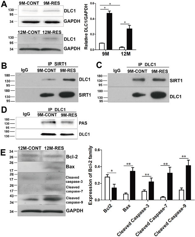 Figure 5: Resveratrol induced apoptosis by up-regulation of DLC1 and interaction between DLC1 and SIRT1, and dephosphorylation of DLC1 with SIRT1 up-regulation. (A) DLC1 expression at 9- and 12-month-old (n = 3 in each group). (B, C) Effects of resveratrol on interaction of DLC1 and SIRT1 at 9-month-old (n = 10 in each group). (D) Effects of resveratrol on phosphorylation of DLC1 (PAS) at 9-month-old (n = 5 in each group). (E) Levels of Bcl-2, Bax, cleaved capsase-3/7/9 at 12-month-old (n = 3 in each group). Data were presented as mean±SD. *p <0.05, **p <0.01.