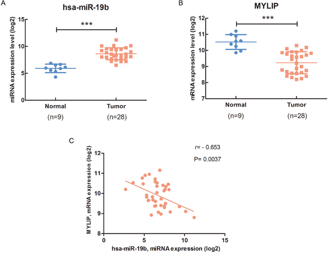 Figure 1: The expression of miR-19b is negatively correlated with MYLIP expression in breast cancer patient samples. (A) The hsa-miR-19b expression level in breast cancer samples (n=28) and adjacent normal breast tissues (n=9). The primary hsa-miR-19b expression data (log2) in breast cancer patients were downloaded from the TCGA database. The asterisks (***) indicate a significant difference (p < 0.001). (B) The MYLIP expression level in breast cancer samples (n=28) and adjacent normal breast tissues (n=9). The primary MYLIP mRNA expression data (log2) in breast cancer patients were downloaded from the TCGA database. The asterisks (***) indicate a significant difference (p < 0.001). (C) The correlation between hsa-miR-19b and MYLIP in breast cancer samples (n=40). The primary hsa-miR-19b expression data (log2) and MYLIP mRNA expression data (log2) in breast cancer patients were downloaded from the TCGA database.