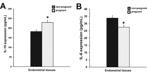 Figure 2: Production of IL-10 and IL-6 in endometrial tissues. IL-10 (A) and IL-6 (B) expression in endometrial tissues of pregnant and non-pregnant cows was measured by ELISA. Columns represent the means. Bars represent the S.E. *P<0.05 values differ significantly from the control group; **P<0.01 values differ extremely significantly from the control group.