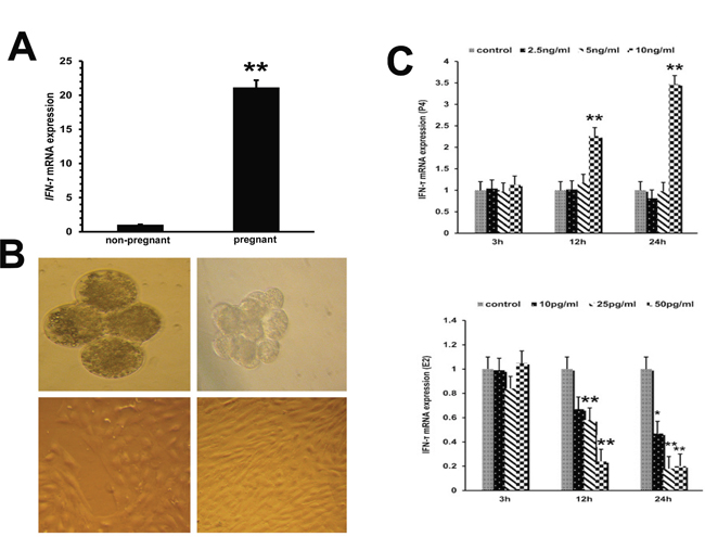 Figure 3: IFN-τ gene expression in embryo trophoblastic cells. (A) IFN-τ mRNA levels in endometrial tissues of pregnant and non-pregnant cows were quantified by RT-qPCR. (B) Parthenogenetic embryo activation and embryo trophoblastic cell culture (40×). (C) Effects of progesterone and estradiol on IFN-τ mRNA expression in ETCs. *P<0.05 values differ significantly from the control group; **P<0.01 values differ extremely significantly from the control group.