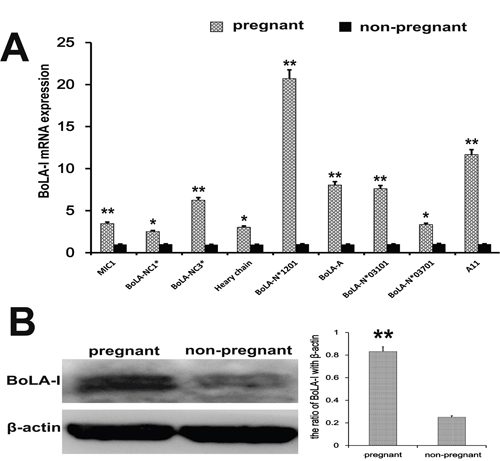 Figure 4: BoLA-I expression in endometrial tissues. (A) MIC1, BoLA-NC1*, BoLA-NC3*, Heavy chain, BoLA-N*01201, BoLA-A, BoLA-N*03101, BoLA-N*03701 and A11 mRNA levels in endometrial tissues of pregnant and non-pregnant cows were quantified by RT-qPCR. (B) Western blotting was performed to detect the BoLA-I protein levels in endometrial tissues of pregnant and non-pregnant cows.*P<0.05 values differ significantly from the control group; **P<0.01 values differ extremely significantly from the control group.
