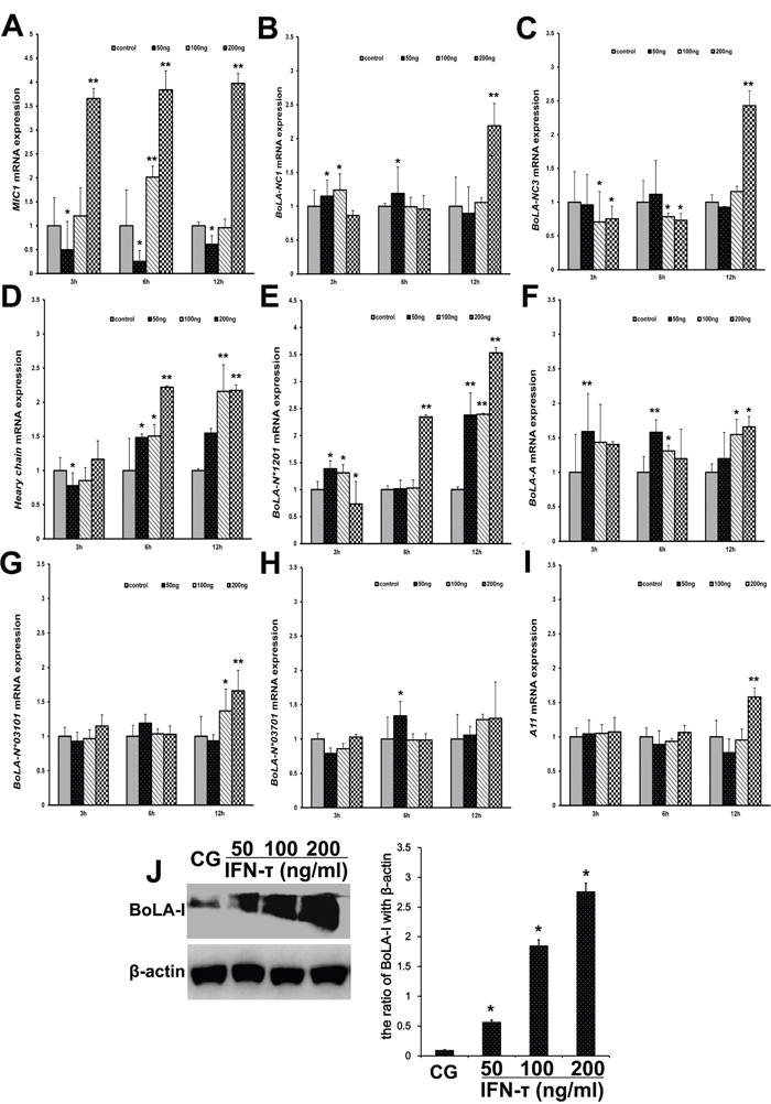 Figure 8: Effect of IFN-τ on BoLA-I expression in EECs. (A) MIC1, (B) BoLA-NC1*, (C) BoLA-NC3*, (D) Heavy chain, (E) BoLA-N*01201, (F) BoLA-A, (G) BoLA-N*03101, (H) BoLA-N*03701 and (I) A11 mRNA levels in EECs were quantified by RT-qPCR after IFN-τ treatment. (J) Western blots were performed to measure the BoLA-I protein levels in the control group (CG) and IFN-τ group in EECs. *P<0.05 values differ significantly from the control group, **P<0.01 values differ extremely significantly from the control group.