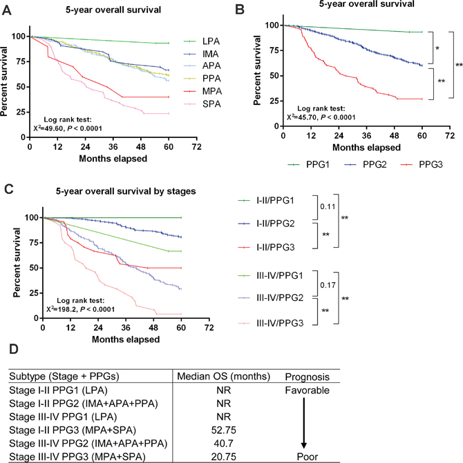 Figure 1: Stage-dependent prognosis was altered by pathological characteristics. (A) 5-year OS curve by pathological subtypes. (B) 5-year OS curve by pathology-based prognostic group (PPG): PPG1=LPA; PPG2=IMA+APA+PPA; PPG3=MPA+SPA. (C) 5-year OS curve by both pathologic subtype and stage. (D) Schematic diagram showing the order of prognosis determined by pathologic subtype and stage. *P < 0.05 and **P < 0.01 considered as statistically significant or highly significant, respectively.