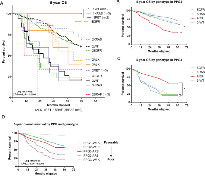 Figure 3: Overall survival determined by both PPG and genetic mutations. (A) Survival curve plotted based on both PPG and genotype. 1, 2, and 3 denote PPG1, 2, and 3, respectively. (B-C) Survival curves by genotypes (ALK, RET, and BRAF were grouped together as ARB) in PPG2 (B) and PPG3 (C) patients. (D) Survival curve according to PPG and combined genotypes (ARB=ALK+RET+BRAF and WEK=WT+EGFR+KRAS). The order of prognosis from favorable to poor is indicated in the right panel. *P < 0.05 considered as statistically significant.