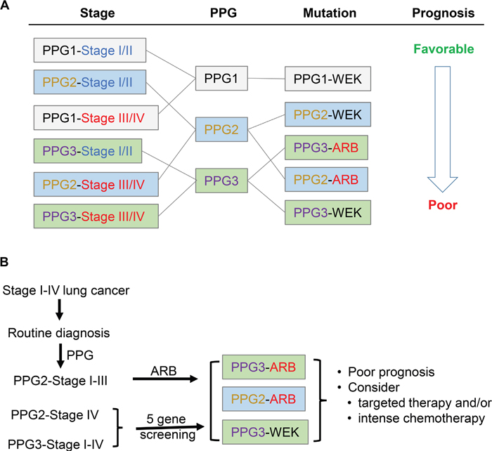 Figure 4: Schematic drawing indicates prognosis determined by tumor pathology, stage, and genetic mutation. (A) Pathology-based prognosis (PPG) was significantly affected by both tumor stage and oncogenic driver mutations. (B) Proposed modification of tumor stage-based routine diagnostic procedures by combining pathologic subtyping and molecular characterization. According to this proposal, lung cancer patients would be subjects for PPG subtyping in addition to routine diagnostic procedures. All PPG2 and 3 patients would then be screened by either ARB or 5 gene-screening. Through these additional procedures additional subgroups of patients with poor prognosis can be isolated and considered for targeted therapy and/or intense chemotherapy.