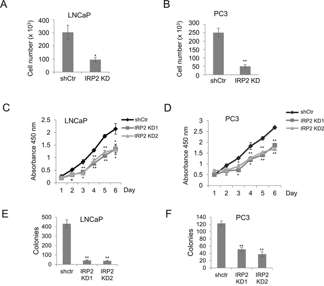Figure 3: IRP2 knockdown inhibits proliferation of prostate cancer cells. (A, B) Cell count by hemocytometer of (A) LNCaP and (B) PC3 shCtr and IRP2 KD cells after 7 days. (C, D) WST-1 proliferation assay of (C) LNCaP and (D) PC3 shCtr and IRP2 KD cells. (E, F) Clonogenic assays for (E) LNCaP (10 days) and (F) PC3 cells (12 days). Data are representative of 3 independent experiments (* p < .05, ** p < .01).