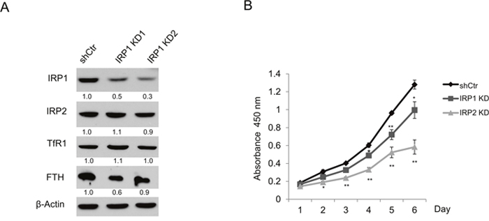 Figure 4: IRP1 silencing does not affect expression of iron proteins and only modestly inhibits proliferation of LNCaP cells. (A) Western blot of iron regulatory protein 1 (IRP1), iron regulatory protein 2 (IRP2), transferrin receptor 1 (TfR1), ferritin H (FTH), and β-actin (loading control) in LNCaP cells infected with lentiviral IRP1-shRNAs (IRP1 KD1 and KD2) and scrambled control shRNA (shCtr). A polyclonal FTH antibody with increased sensitivity was used for this experiment [47]. (B) WST-1 proliferation assay of LNCaP shCtr, IRP1 KD, and IRP2 KD cells. Data are representative of 3 independent experiments (* p < .05, ** p < .01).