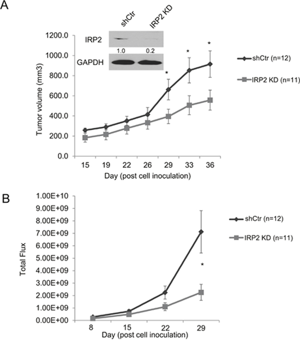 Figure 7: IRP2 deficiency inhibits tumor growth of prostate cancer cells in vivo. Luciferase expressing PC3 (PC3/Luc) cells were infected with lentiviral scrambled control shRNA (shCtr) or IRP2-shRNA (IRP2 KD). 2 x 106 PC3/Luc cells were inoculated into flanks of nude mice by subcutaneous injection. (A) Western blot of iron regulatory protein 2 (IRP2) and GAPDH (loading control) at day 0. Tumor growth was evaluated by caliper measurement at 15, 19, 22, 26, 29, 33, and 36 days post-inoculation. (B) Tumor growth was evaluated by bioluminescent luciferase imaging at 8, 15, 22, and 29 days post-inoculation. Data are means ± Standard Error with n=11/12 (* p < .05).