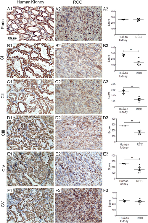 Figure 1: RCC shows reduced levels of OXPHOS complexes I–IV. Immunohistochemical staining of porin and the OXPHOS complexes was performed (A1–F1) on normal human kidney, (A2–F2) and on RCC xenografts. (A3–F3) Graphs indicate score values of staining intensity. Data are given as mean ± SEM. Statistical analysis was performed by using student’s t test (unpaired samples), ##p < 0.01; n = 3 (human kidney) and n = 5 (RCC). CI-CV, complexes I–V.