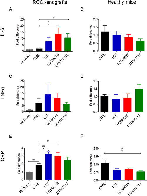 Figure 6: KDs tended to increase inflammatory cytokines in the livers of RCC xenograft recipients, but not in the livers of healthy mice. mRNA levels of (A, B) IL-6, (C, D) TNFα and (E, F) CRP in liver tissue from (A, C, E) RCC bearing mice fed with CTRL or KDs compared to healthy mice fed with CTRL diet, and (B, D, F) from healthy mice fed with CTRL or KDs. Data are given as mean ± SEM. Statistical analysis was performed by using the student’s t test (unpaired samples) to compare CTRL vs. a certain KD, #p < 0.05, ##p < 0.01 and one-way ANOVA (Kruskal-Wallis test) was performed to correct to multiple comparison, *p < 0.05; (A, C, E) n = 4 for the no tumor group; n = 5 for CTRL and LCT/MCT8 groups; n = 6 for LCT and LCT/MCT10 groups; (B, D, F) n = 5 for CTRL and LCT groups; n = 6 for LCT/MCT8 and LCT/MCT10 groups.
