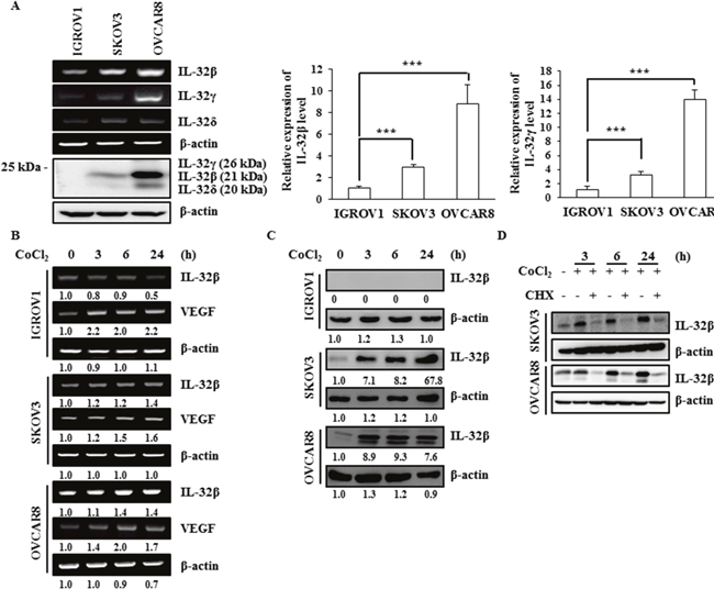Figure 1: IL-32β levels increase under hypoxic conditions in ovarian cancer cells. (A) The IL-32 levels in the human ovarian cancer cell lines IGROV1, SKOV3, and OVCAR8 were determined by RT-PCR, qRT-PCR, and immunoblot assays. The qRT-PCR results were normalized with the level of IL-32β and IL-32γ in IGROV1 cells, respectively. The data shown represent one of three independent experiments carried out in triplicate. (B, C) SKOV3 and OVCAR8 cells were treated with 150 μM CoCl2 and the IL-32β levels were determined by RT-PCR and immunoblot assays at the indicated times. The bands were quantified using ImageJ software and the numbers indicate the comparison of each lane. (D) SKOV3 and OVCAR8 cells were treated with 150 μM CoCl2 and 5 μg/mL CHX. The IL-32β levels were determined by immunoblot assay at the indicated times.