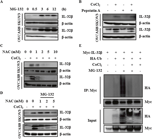 Figure 2: ROS inhibit ubiquitin-dependent IL-32β degradation. (A) SKOV3 and OVCAR8 cells were treated with 5 μM MG-132 and the IL-32β levels were determined by immunoblot assay at the indicated times. (B) SKOV3 and OVCAR8 cells were pretreated with 1 μg/mL pepstatin A for 1 h, and then treated with 150 μM CoCl2. (C) SKOV3 and OVCAR8 cells were pretreated with NAC for 1 h, and then treated with 150 μM CoCl2. (D) SKOV3 and OVCAR8 cells were pretreated with NAC for 1h, and then treated with 150 μM CoCl2 and MG-132. (E) HEK 293T cells were transfected with Myc-IL-32β and HA-Ub, and then treated with 150 μM CoCl2 or 5 μM MG-132. The cell lysates were immunoprecipitated with anti-Myc antibody and the interaction was examined by immunoblot assay.