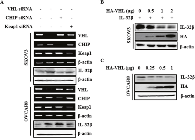 Figure 3: IL-32β is regulated by E3 ligase VHL. (A) SKOV3 and OVCAR8 cells were transfected with VHL siRNA, CHIP siRNA, and Keap1 siRNA. The VHL, CHIP and Keap1 levels were determined by RT-PCR. The IL-32β levels were determined by immunoblot assay. (B) SKOV3 cells were co-transfected with IL-32β and HA-VHL-expressing plasmids. The IL-32β and VHL levels were determined by immunoblot assay. (C) OVCAR8 cells were transfected with HA-VHL. The IL-32β and VHL levels were determined by immunoblot assay.
