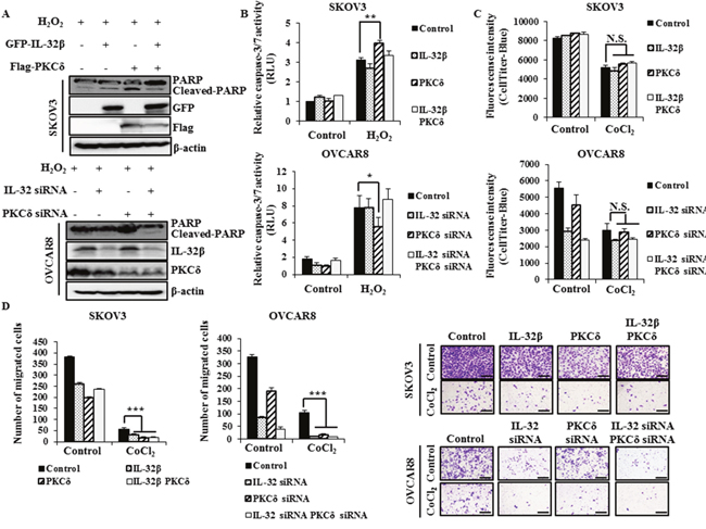 Figure 6: IL-32β prevents PKCδ-induced apoptosis under oxidative stress. (A, B) SKOV3 cells were transfected with GFP-IL-32β and Flag-PKCδ for 24 h, whereas OVCAR8 cells were transfected with IL-32 siRNA and PKCδ siRNA for 48 h. The transfected cells were treated with 100 μM H2O2 for 24 h. The caspase-3/7 activity was assessed using a luminescent assay. The cleaved-PARP levels were determined by immunoblot assay. (C) SKOV3 cells were transfected with GFP-IL-32β and Flag-PKCδ. OVCAR8 cells were transfected with IL-32 siRNA and PKCδ siRNA, and then treated with 150 μM CoCl2 for 24 h. The proliferation was assessed using CellTiter-Blue. (D) SKOV3 cells were transfected with GFP-IL-32β and Flag-PKCδ, whereas OVCAR8 cells were transfected with IL-32 siRNA and PKCδ siRNA. The transfected cells were seeded onto the upper part of a Transwell chamber in serum-free medium with or without 150 μM CoCl2. The migrated SKOV3 and OVCAR8 cells were counted after 24 or 48 h incubation, respectively. Scale bars = 10 μm.