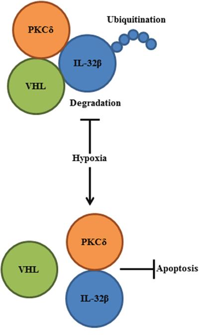 In the present study, we investigated the function of IL-32β in human ovarian cancer cells which is one of the representative female cancers. Our results revealed that IL-32β is degraded by VHL-mediated ubiquitination, a process that is prevented by hypoxia-induced reactive oxygen species (ROS) production. PKCδ forms trimers with IL-32β and VHL. Under hypoxic conditions, the interaction between IL-32β and PKCδ is sustained, whereas that with VHL is disrupted. In turn, the increased IL-32β level reduces PKCδ-mediated apoptosis under oxidative stress.