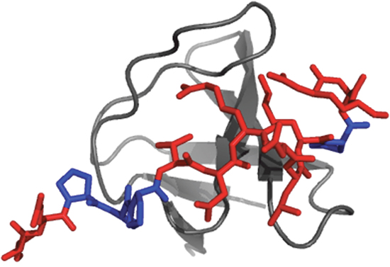 Figure 1: Cartoon representation of the Gab2-Grb2 SH3C complex. Three-dimensional structure of the complex between the C-terminal SH3 domain of the Grb2 protein (Grb2 SH3C) and a peptide representing the residues 503-524 of the Grb2-associated binding protein 2 (Gab2503-524). The SH3 domain is represented in gray while the peptide is represented in red. The four proline residues of Gab2503-524 are highlighted in blue. The picture was generated using the software PyMOL (pdb code: 2vwf). Crystallization conditions were 50mM HEPES pH 7.5, 50mM NaCl (peptide:protein 3:1 molar ratio); reservoir: 0.7 M tri-sodium citrate, 0.1 M Tris pH 8.5.