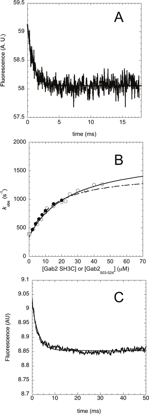In an effort to understand the order of the events in the folding reaction of Gab2503-524 upon binding to Grb2 SH3C, we resorted to apply a kinetic test, originally introduced by Olson et al [31] and more recently applied on different protein systems [32–34]. This experimental strategy is essentially based on the comparison of the observed binding kinetics when performing pseudo-first order experiments with respect to each ligand. Thus, we performed relaxation binding experiments between Gab2503-524 and Grb2 SH3C by temperature jump. In particular, a constant concentration of Grb2 SH3C was mixed with different excess concentrations of Gab2503-524 and the resulting solution was subjected to a rapid increase of temperature of 9°C, from 16 to 25°C, using capacitor-discharge temperature-jump instrument. Similarly, we performed binding experiments by keeping the concentration of Gab2503-524 constant and varying the concentration of an excess of Grb2 SH3C. Binding was observed by monitoring the change in fluorescence of Grb2 SH3C, which is primarily ascribed to residues W35 and W36. A typical temperature jump trace is reported in Figure 2A. Under all the experimental conditions here considered, the binding time courses were consistent with a single exponential decay. While this observation, to a first approximation, may be consistent with a two-state mechanism, a detailed analysis of the observed rate constants, as shown below, revealed an additional level of complexity.