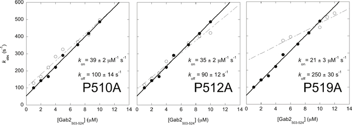 Figure 3: Alanine scanning of the proline residues of Gab2503-524 measured by using a stopped-flow apparatus at 10°C. The observed rate constants are plotted as a function of increasing Gab2503-524 concentration, while keeping Grb2 SH3C at a constant concentration of 0.5 μM. In each graph both Gab2503-524 wild-type (filled circles) and mutant (empty circles) are shown. Mutant P511A was not shown because it was not possible to measure any detectable binding. The observed rate constants follow a linear dependence from which the association (kon) and dissociation (koff) rate constants can be calculated. The calculated kon and koff for Gab2503-524 wild-type are 43 ± 1 μM-1 s-1 and 53 ± 7 s-1 respectively.