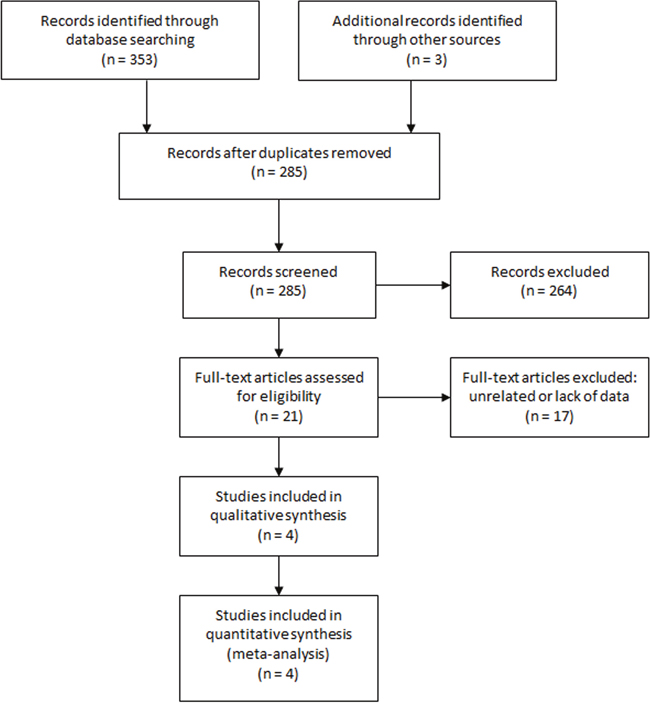 The initial literature search identified 356 studies. After removing duplicates, 285 studies were reviewed for titles and abstracts. Six reviews, 13 case reports and 245 unrelated articles were excluded. The rest 21 studies were assessed in full text and 17 were excluded due to unrelated or lack of enough data. Finally, 4 studies [3, 11, 14, 15] were included in this meta-analysis. The study selection process was shown in Figure 1.
