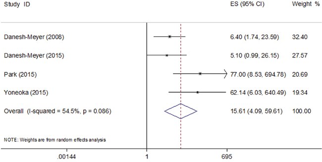 The patients in the two studies by Danesh-Meyer et al. [14] and Yoneoka et al. [15] were all with pituitary adenomas and were treated with transsphenoidal surgery except one with transcranial surgery. We grouped the two studies into pituitary adenomas group/transsphenoidal group, and the rest two into mixed tumors group/non-transsphenoidal group. The pooled OR in the pituitary adenomas group/transsphenoidal group was 15.41 (95% CI, 1.35-175.70) and the pooled OR in the mixed tumors group/non-transsphenoidal group was 18.84 (95% CI, 1.68-211.09).