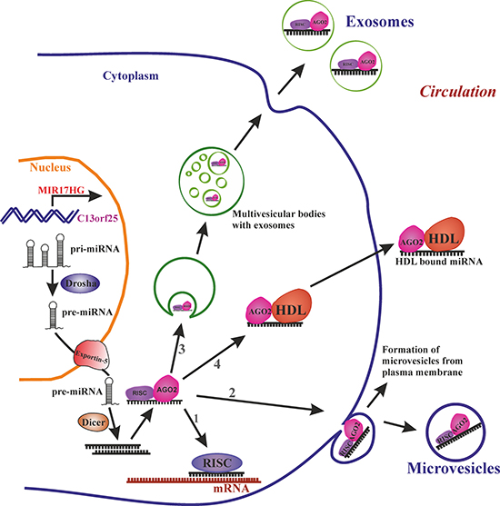 Figure 1: miRNA biogenesis and release into circulation. Transcribed primary miRNA (Pri-miRNA) processed to precursor miRNA (Pre-miRNA) in the nucleus is exported to cytoplasm by exportin-5. In the cytoplasm pre-miRNA is processed to mature miRNA by Dicer. The mature miRNA further (1) can target the mRNA in cytoplasm, or bind to RNA-binding protein Ago-2 and release to circulation via (2) loading the miRNA-Ago2 complex to microvesicles which are formed by budding of plasma membrane or (3) loaded in to smaller vesicles called exosomes which are formed by endosomal invagination, can form multivesicular bodies (MVB) and upon fusion of MVBs to plasma membrane exosomes are released into circulation or (4) miRNA-Ago2 complex can directly interact with high-density lipoproteins (HDL) and be released into circulation.