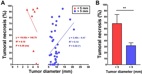 Figure 2: Comparison of CA4P therapeutic efficacy between micro-HCCs and larger HCCs. (A) Scatter plots of percentage of CA4P-induced tumoral necrosis in micro-HCCs ≤ 5 mm and in HCCs > 5 mm. Significant negative linear correlation was identified between CA4P-induced tumoral necrosis and tumors with diameter > 5 mm (*P < 0.05), while tumoral necrosis was not linearly correlated with tumors with diameters of ≤ 5 mm. (B) Bar chart comparing the mean percentage of CA4P-induced tumoral necrosis between micro-HCCs of ≤ 5 mm and larger HCCs of > 5 mm (**P < 0.01).