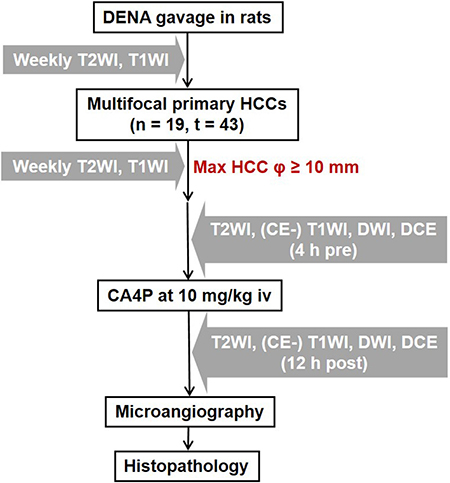 ADC: apparent diffusion coefficient; CA4P: combretastatin A-4 phosphate; CE: contrast-enhanced; DCE: dynamic contrast enhanced; DENA: diethylnitrosamine; DWI: diffusion-weighted imaging; EES: extracellular extravascular space; EPI: echo-planar imaging; GE: gradient echo; H&E: hematoxylin and eosin; HCC: hepatocellular carcinoma; MRI: magnetic resonance imaging; PAS: periodic acid-Schiff; RECIST: Response Evaluation Criteria in Solid Tumors; ROI: region of interest; SD: Sprague Dawley; SEM: standard errors of the mean; SI: signal intensity; T1WI: T1-weighted imaging; T2WI: T2-weighted imaging; TSE: turbo spin echo; VDA: vascular disrupting agent.