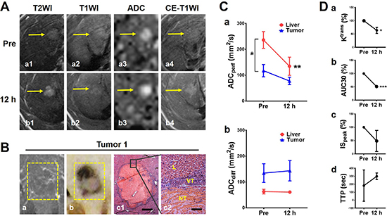 Figure 3: In vivo MRI and post-mortem verifications of a representative micro-HCC with nearly complete necrosis induced by CA4P. (A) In vivo MRI findings of microcancer Tumor 1 (arrows): on T2WI, hyperintense before treatment and increased hyperintensity at 12 h (a1-b1); on precontrast T1WI, there were no obvious changes with nearly isointensity (a2-b2); on ADC map, moderate hyperintense at baseline and increased signal at 12 h (a3-b3); and on CE-T1WI, minimal enhancement at baseline and delayed contrast enhancement at 12 h after CA4P treatment (a4-c4). (B) Corresponding microangiography (a) depicted scarce tumor vascularity. Macrophotograph (b) and histopathology (H&E staining; c1, × 25 original magnification, scale bar = 400 μm; c2, × 200 original magnification, scale bar = 50 μm. NT: necrotic tumor; VT: viable tumor; L: liver.) revealed nearly complete intratumoral necrosis. (C) Quantification of ADCs derived from DWI. ADCperf (a) indicated blood perfusion sharply decreased in cirrhotic liver after CA4P treatment (**P < 0.01) with a decline also in tumor. Compared with live perfusion, tumor perfusion was less both before and after treatment (*P < 0.05). ADCdiff (b) slightly increased at 12 h suggestive of CA4P-induced intratumoral necrosis, while liver ADCdiff did not show significant change. (D) Quantification of DCE-MRI biomarkers. Quantitative parameter, percentile value of volume transfer constant Ktrans (a, *P < 0.05) as well as semi-quantitative parameters including percentile values of area under curve AUC30 (b, ***P < 0.001) and maximal initial slope ISpeak (c) and time to peak TTP (d), consistently reflected a reduction of blood flow in necrotic microcancers at 12 h.
