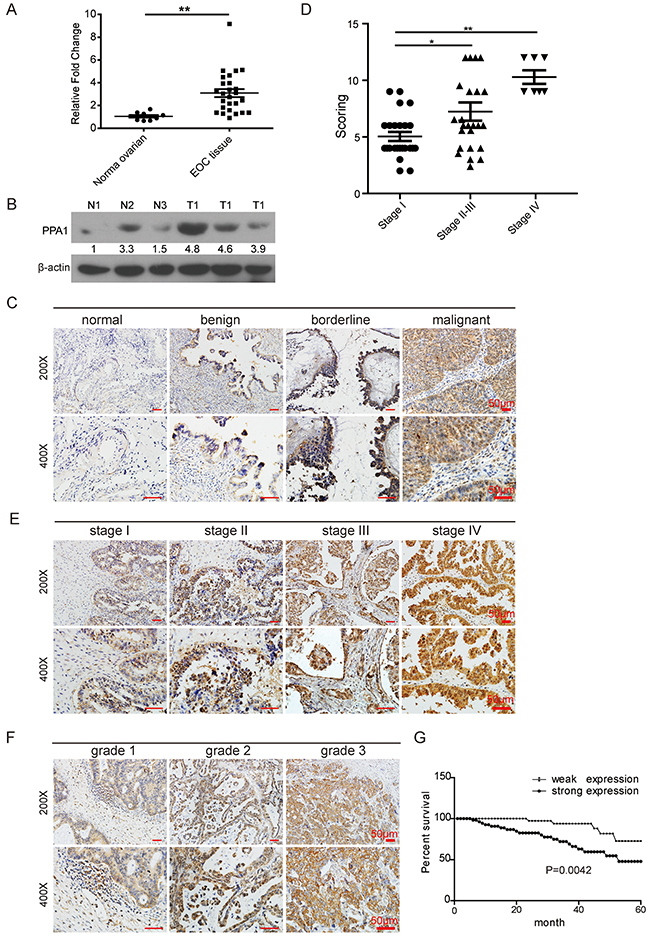 Figure 1: Validation of PPA1 expression in EOC. (A) Expression of PPA1 mRNA in fresh EOC tissues and normal ovarian tissues tested with qRT-PCR. (B) Expression of PPA1 validated by western blot analysis in three individual EOC tumor samples (T: tumor samples) and three individual normal samples (N: normal ovarian tissues). (C) Representative IHC staining of PPA1 (brown) in normal ovarian tissues, benign ovarian tumor, borderline ovarian tumor, and EOC tissues. (D) PPA1 expression pattern in EOC at different histological stages. (E) Representative IHC staining of PPA1 (brown) in EOC with different histological stages. (F) Representative IHC staining of PPA1 in EOC at different histological grades. (G) Expression of PPA1 in relation to patients’ survival in EOC.