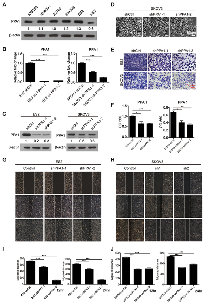 Based on several results, high PPA1 expression can promote the occurrence and development of ovarian cancer, and PPA1 expression is positively correlated to a poor prognosis for ovarian cancer. First, compared to normal ovarian tissues and benign ovarian tumors, we found that PPA1 was overexpressed in human EOC tissues. Clinical pathological analysis showed PPA1 expression is positively correlated with increases in FIGO stage and histological grade. Second, higher PPA1 expression in EOC tissues decreased the five-year survival rate. Third, depletion of PPA1 suppressed migration of ES2 and SKOV3 EOC cells. Fourth, tumor metastasis was inhibited after PPA1 was silenced in vivo.