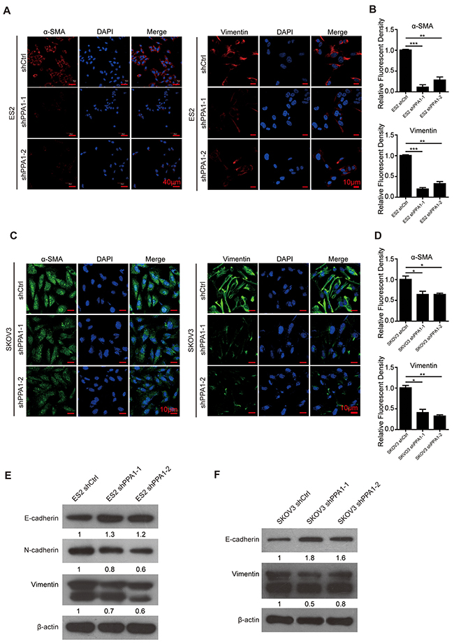 Metastasis in ovarian cancer is established by the EMT-driven delamination of ovarian cancer cells from the primary tumor in situ, and subsequent penetration into the surrounding peritoneal cavity [21-23]. Based on our results, we showed that PPA1 may promote EMT. First, the EOC cell line SKOV3 gained epithelial characteristics and lost mesenchymal-like properties after PPA1 was silenced. Second, western blot and immunofluorescence revealed that silencing of PPA1 down-regulated the expression of markers associated with mesenchymal cells (e.g., N-cadherin, α-SMA, or Vimentin), while it up-regulated the expression of epithelial cell markers (e.g., E-cadherin). Third, PPA1 expression was negatively associated with E-cadherin expression, but positively correlated with Vimentin expression.