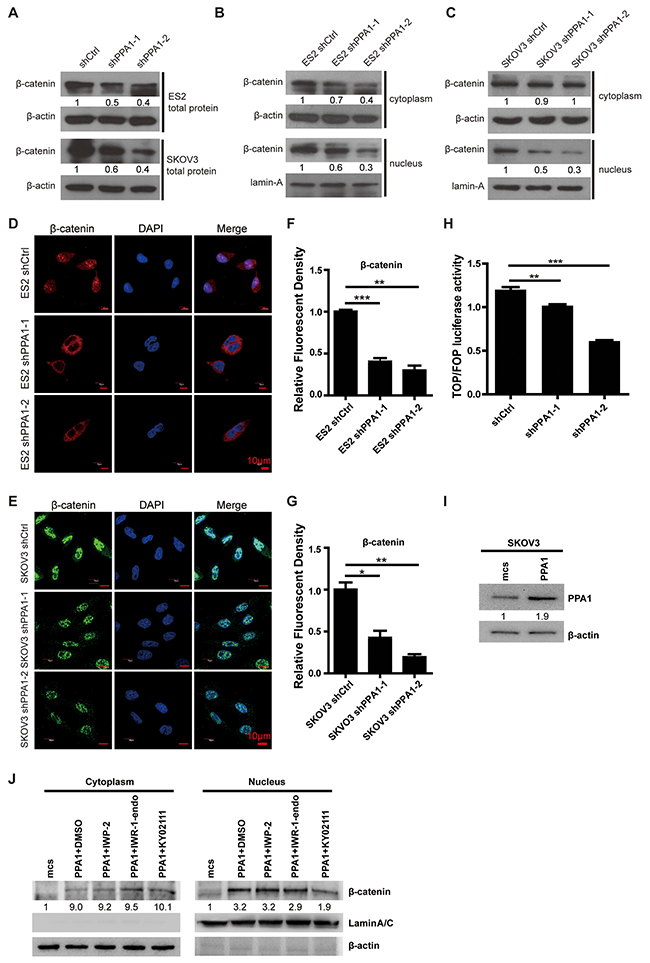 Figure 5: Silencing PPA1 suppresses Wnt/β-catenin signaling pathway. (A) Silencing PPA1 decreased β-catenin expression from whole cell lysates in ES2 and SKOV3. (B, C) Silencing PPA1 down-regulated nuclear β-catenin expression. (D, E, F, G) β-catenin translocation was inhibited in PPA1-silenced ES2 and SKOV3 cells compared to control cells, by immunofluorescence. (H) TCF activation was measured with a dual-luciferase reporter gene assay, and silencing PPA1 inhibited TCF activation. (I) Overexpression of PPA1 in SKOV3 cells was validated by western blotting. (J) β-catenin expression in cytoplasm and nucleus of SKOV3-PPA1 cells after treatment with Wnt/β-catenin-specific inhibitors by western blotting.