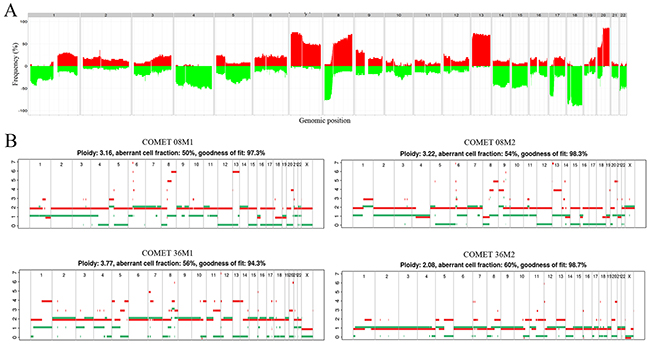 Somatic CNAs were analyzed using Genome-Wide Human SNP array 6.0 (Affymetrix). Raw data was normalized to HapMap by Affymetrix Power tools. Copy number profiles were obtained using ASCAT algorithm [14]. Following segmentation, the core ASCAT algorithm determines the fraction of non-aberrant cells and the tumor ploidy (the average number of DNA copies), and generates an ASCAT profile. Copy number profiles were successfully obtained for 50 of 56 metastases with sufficient tumor percentage. Subsequently, ASCAT results were used to obtain average CNA profiles for all tumor samples included in the study cohort, and for quantitative assignment of deletion or amplification of selected cancer-related genes from the AmpliSeq panel.