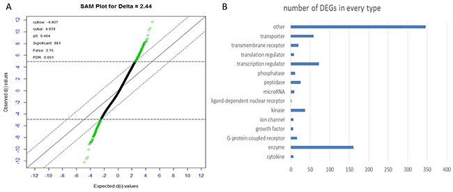 Figure 2: (A) Plot of the observed d-values vs. the ordered expected d-values. Each gene is represented by a dot, and the differentially expressed genes are colored in green. Compared to control group, there are 421 genes being significantly up-regulated (green dots above) and 376 genes being significantly down-regulated in HCC (green dots below) at an FDR of 0.1%. (B) Plot of the number of significant genes vs. types identified from DEGs from IPA.