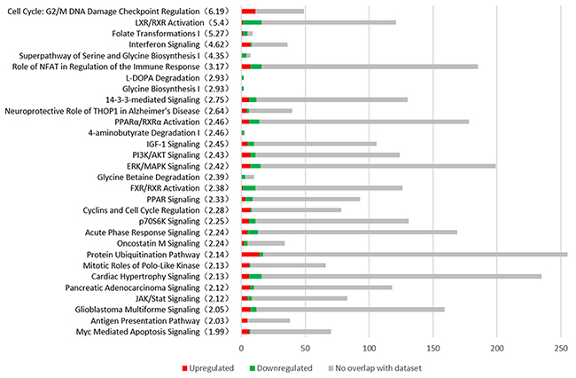 Figure 3: The most representative canonical pathways associated with the early stage of HCC are shown from Ingenuity Pathway Analysis (IPA). The number of DEGs are shown in the figure. Red represents the up-regulated genes, the green represents the down-regulated genes and the grey represents the no overlap genes with dataset. The significance (-log p value) of every pathway is indicated in parenthesis.