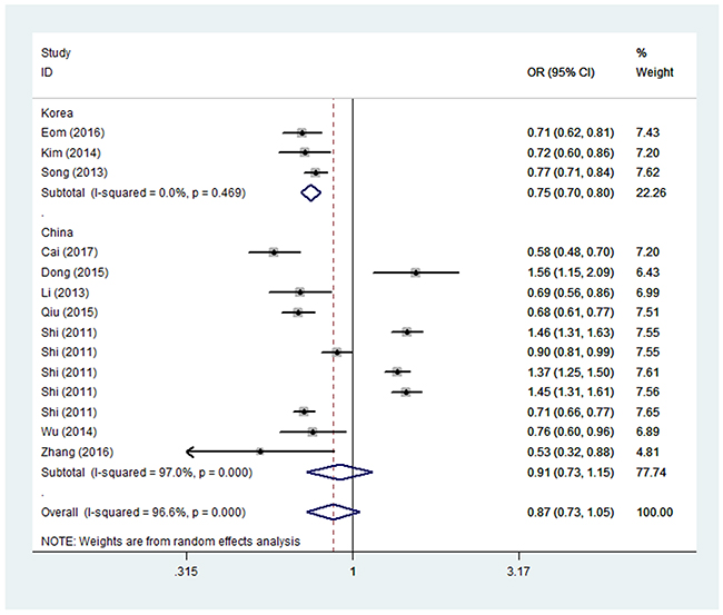 Figure 3: Forest plot of GC risk associated with PRKAA1 rs13361707 C/T polymorphism (TT vs. CC) by source of country. The squares and horizontal lines correspond to the study-specific OR and 95% CI. The area of the squares reflects the weight (inverse of the variance). The diamond represents the summary OR and 95% CI. Each point represents a separate study for the indicated association. Log [OR], natural logarithm of OR. Horizontal line, mean effect size.