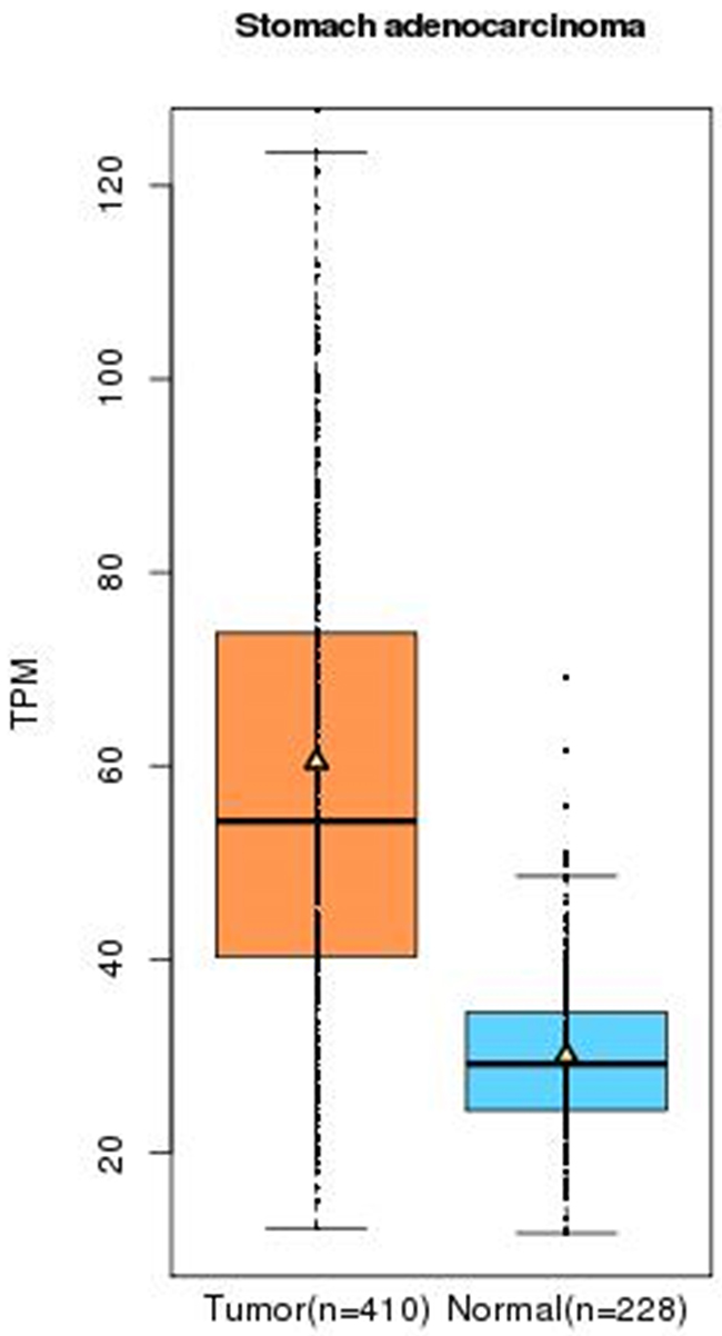 Figure 5: The relative expression of PRKAA1 in GC tissue and paracancerous tissue (Normal) using TCGA database. TPM (Transcripts Per Kilobase Million) stands for the expression of PRKAA1 in each tissue.