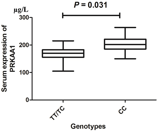 We collected 200 serum samples of GC patients in the present study with different genotypes of the PRKAA1 rs13361707 C/T polymorphism. The distribution observed for the TT, TC, and CC genotypes was 40 (20%), 64 (32%) and 96 (48%), respectively. Moreover, serum PRKAA1 levels in GC patients with TT/TC genotypes were significantly lower than in those with CC genotypes (171.18 ± 76.58 μg/L vs. 209.13 ± 51.65 μg/L, P = 0.031; Figure 5).