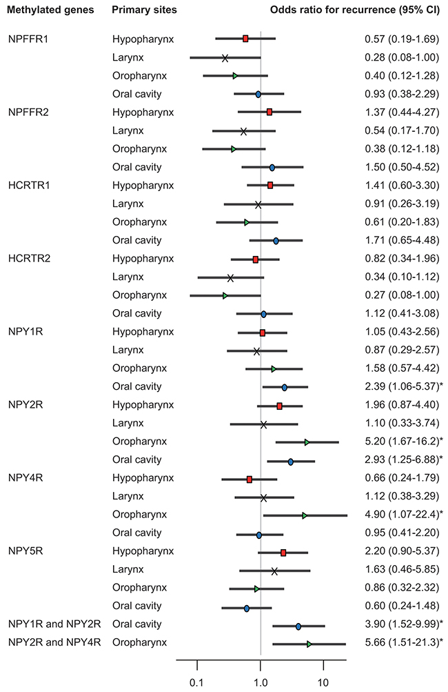 Odds ratios for recurrence according to tumor origin were also determined. When the NPY1R andNPY2R promoters were methylated in patients with oral cancers, the ratios were 2.39 (95% CI, 1.06–5.37; P = 0.036) and 2.93 (95% CI, 1.25–6.88; P = 0.014), respectively, and the hazard rate was 3.9 times higher (95% CI, 1.52–9.99; P = 0.005) (Figure 3). Methylation of the NPY2R and NPY4R promoters correlated positively with recurrence in patients with oropharyngeal cancers, both individually (odds ratio, 5.20; 95% CI, 1.67–16.2; P = 0.005 and odds ratio, 4.90; 95% CI, 1.07–22.4; P = 0.004, respectively) and together (odds ratio, 5.66; 95 % CI, 1.51–21.3; P = 0.010).