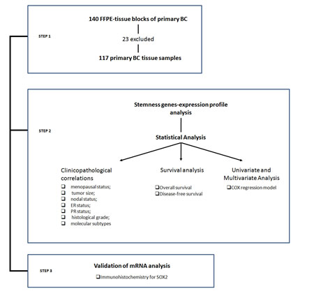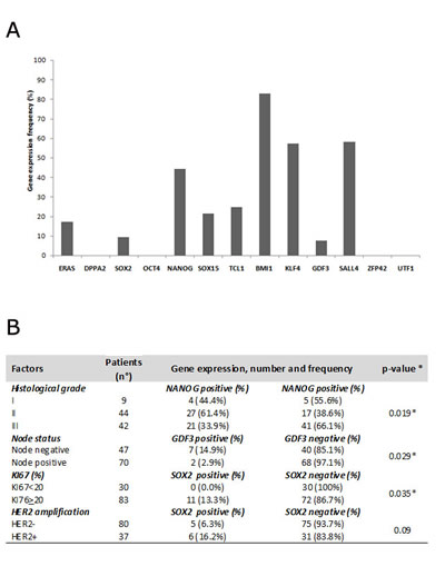 On the basis of the literature and our previous experience, we tested a panel of thirteen stemness genes in a significant number of BC tissue samples in order to understandhow specific TFs are expressed in BCs and whether they could significantly correlate with pathological characteristics and clinical outcome.